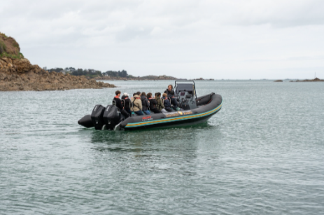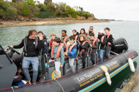 Il s’agit cette fois de d’enfants des écoles primaires de Carantec et de collégiens de la classe mer du collège des deux baies, accompagnes par un parent d’élève et Monsieur Caradec, proviseur du collage, qui attendent la vedette « Les Vagabonds de la baie » pour aller assister à la régate de la CNP 2026